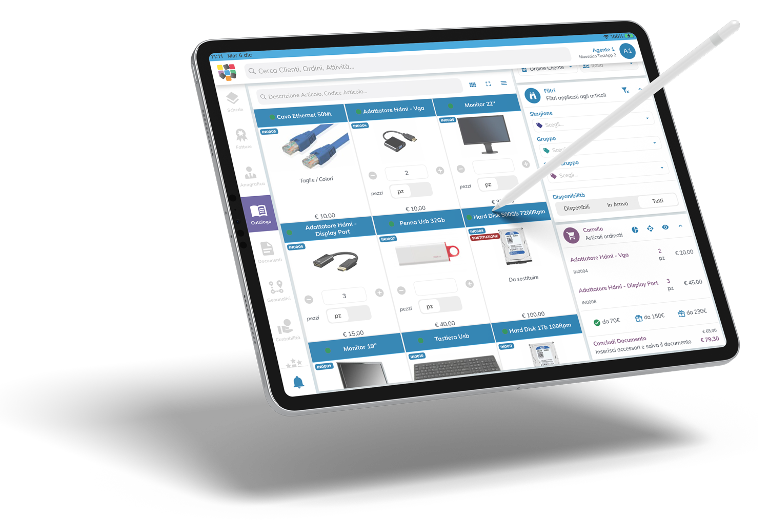 Il modulo Catalogo fornisce informazioni relative a: prodotti, gestione dei preferiti, ricerca rapida degli articoli per filtri, visualizzazione delle schede tecniche e gallery in HD. Esporta il tuo catalogo in pdf e caricane uno interattivo e personalizzabile.