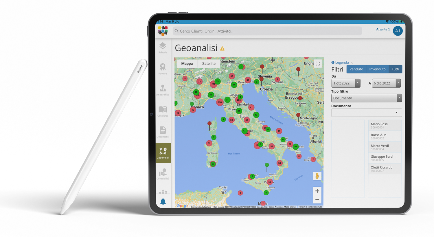 Con i moduli di Geoanalisi e BI, avrai sempre a portata di mano un potente strumento di analisi che, attraverso statistiche personalizzabili, ti fornirà un controllo totale sullo stato della tua rete di vendita.