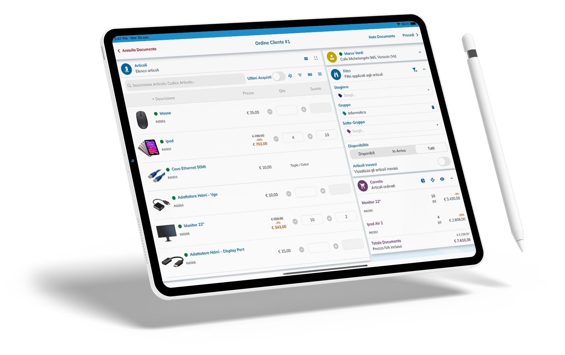 Grazie al modulo ORDINI B2B, puoi creare un efficiente eCommerce B2B. Fai scaricare l’app ai clienti o fornisci l’accesso alla parte web e saranno loro a inserire gli ordini al posto degli agenti, direttamente dal catalogo aggiornato in tempo reale.