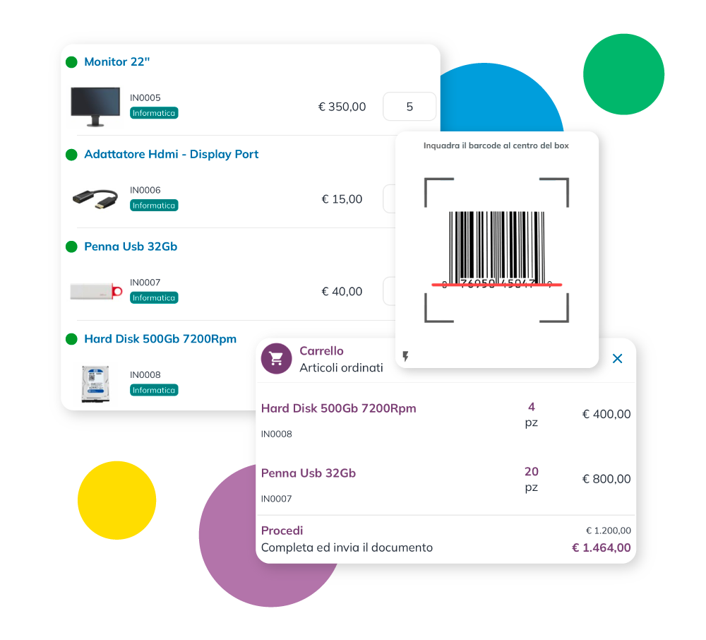 Scansiona l’articolo con un lettore barcode manuale e questo apparirà automaticamente nel documento in elaborazione. Tieni traccia degli articoli selezionati tramite vibrazione o suono personalizzato al momento dell’aggiunta in app.