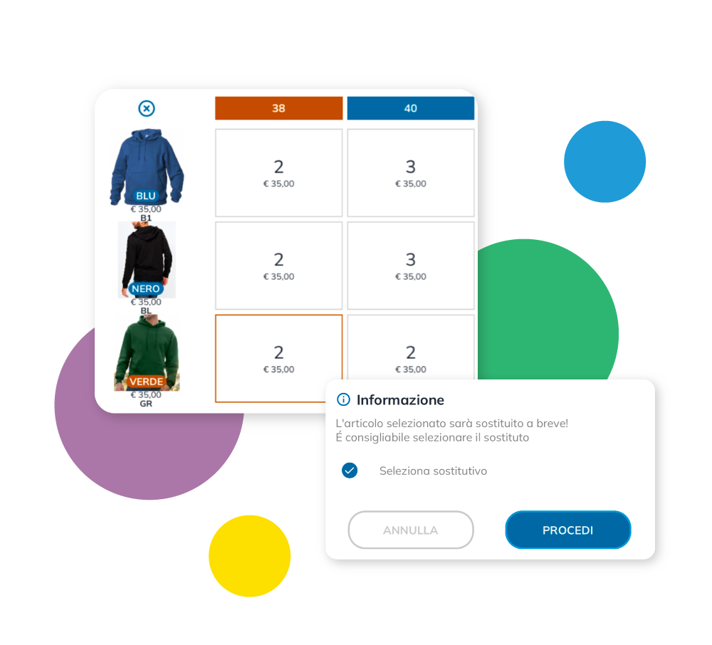 Una volta inserito un articolo, comparirà una tabella dalla quale sarà possibile selezionare taglia, colore e modello, comprese le eventuali variazioni di prezzo aggiornate automaticamente.